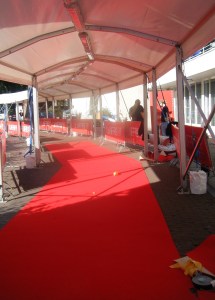 Gelukkig worden we na de korte lunchbreak (met super lekker brood en super lekker beleg, wat wordt er toch goed voor je gezorgd achter de schermen!) gesplitst. Ik ‘mag’ samen met Bernard, Patries en een nieuw meisje, Annelies, de rode loper gaan leggen voor de ingang van de Stadschouwburg. Ik blijk niet de enige van de bouwploeg te zijn die graag een trui maat S gehad had willen hebben want Annelies is pas echt een klein dun meisje. Ook haar stem is klein en dun en ze lacht zenuwachtig. Maar ze weet wél goed hoe je dranghekken moet tillen en ze is een ster in het snijden van rode lopertapijt. En tegen het einde van de middag bijt ze zomaar opeens van zich af in een rake opmerking tegen Bernard, na zijn zóveelste flauwe grap.