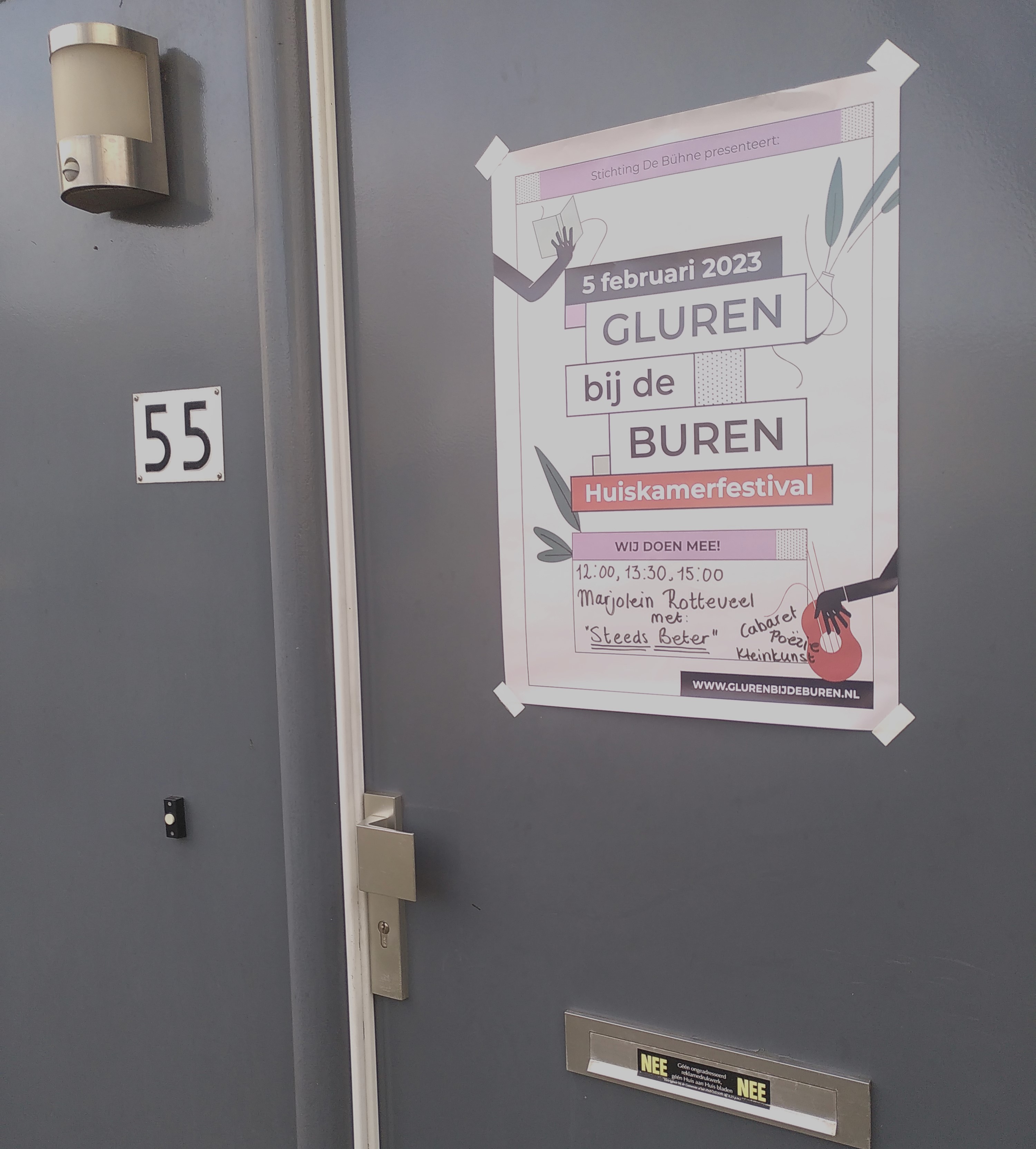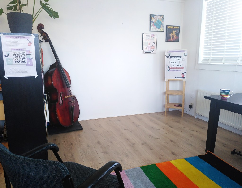 Ik dronk mijn thee, at een paaseitje en danste een beetje heen en weer over de overloop. Totdat er vanaf beneden hard geroepen werd “Marjolein? Ben je klaar?”. “Ja!”, riep ik terug. Koptelefoon af. Luisteren naar Robin die de MC-rol op zich nam, een praatje over Gluren bij de Buren, gezellig wat contact met het publiek en daarna (“geef haar een héél hard applaus”) mijn aankondiging. Ik trok mijn kleding nog een keer recht, nam diep adem en liep de trap af. De woonkamer in, langs het publiek, naar mijn plek daar op de vloer, tussen de kast en het raam. Tegenover 15 man publiek. “Goedemiddag!”